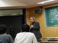 上映会を行った「蟻の兵隊」にもご出演なさっていた森原一氏の 講演会には,多くの方が参加してくださいました。森原さんの体験 談は迫力があり,学生の皆さんもとても強く興味をもたれ,熱心に 聞かれておられました。講演後の質問も多く,中には参加できない ことから質問を友達にたくされた方などもおられ,本当に熱気にあ ふれた講演会となりました。 |